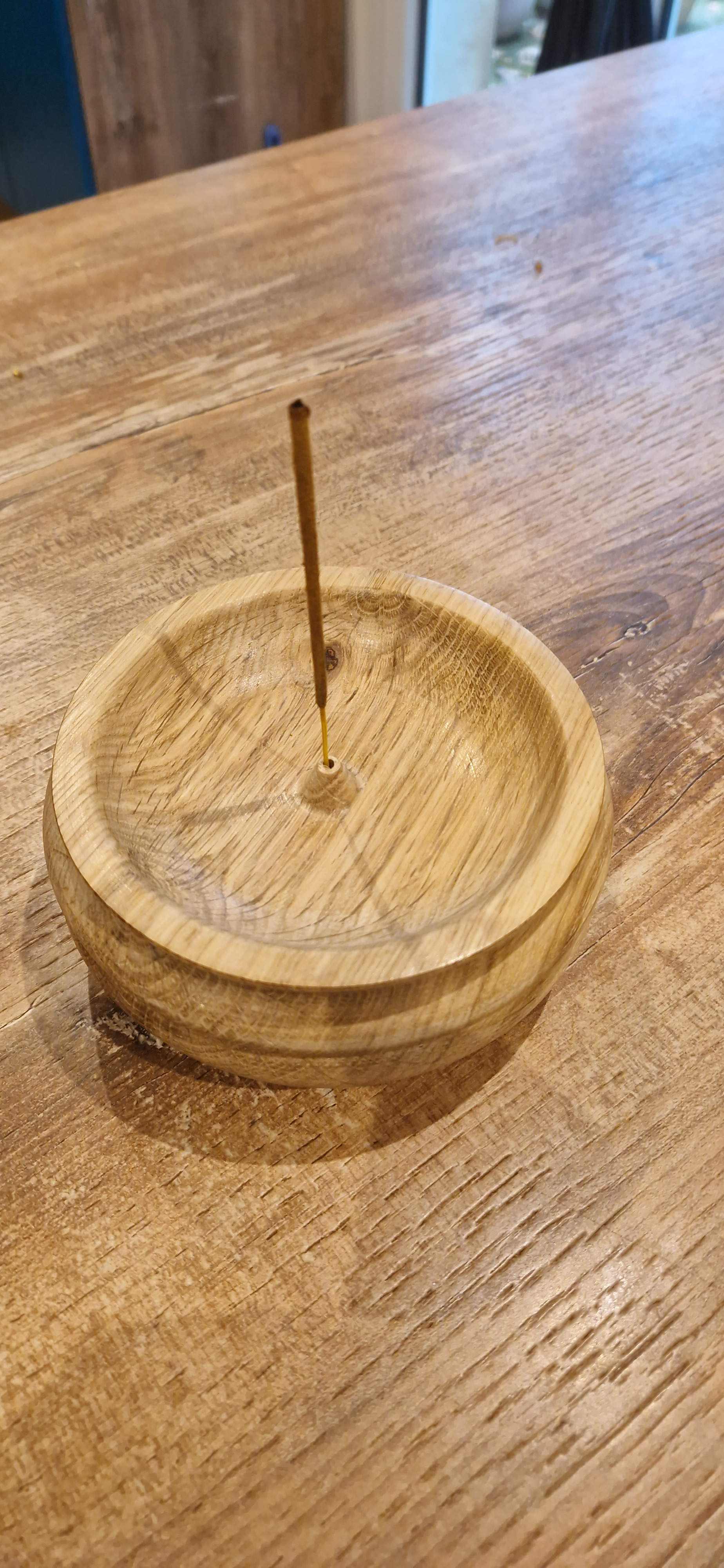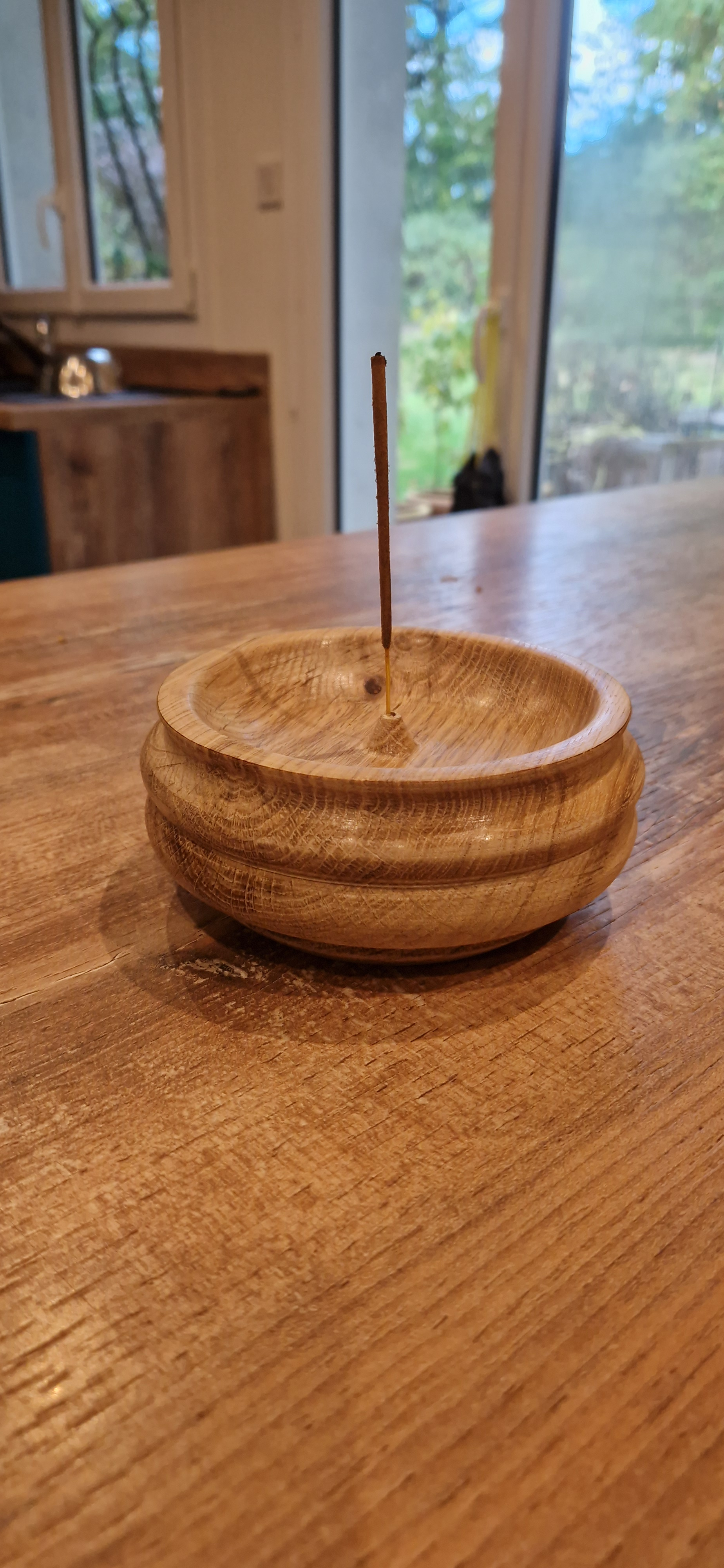 Superbe brûle encens en Chêne massif. Les dessins naturel du bois sont exceptionnels. Un perçage central permet l'insertion de bâtonnets d'encens. la surface concave recueille les cendres pour ne pas salir votre table.